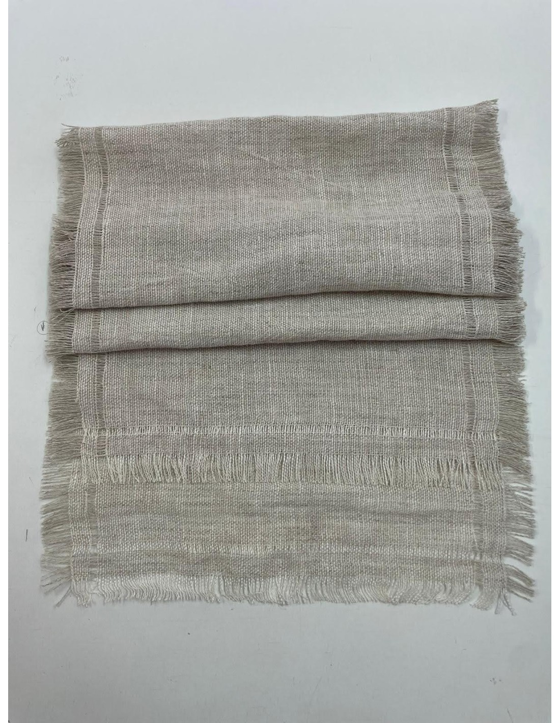 Camino de mesa rectangular desflecado perimetral y canal decorativo, composicion 70% lino 30% poliester, color beige de medidas 40 cm de ancho por 140 cm de largo
