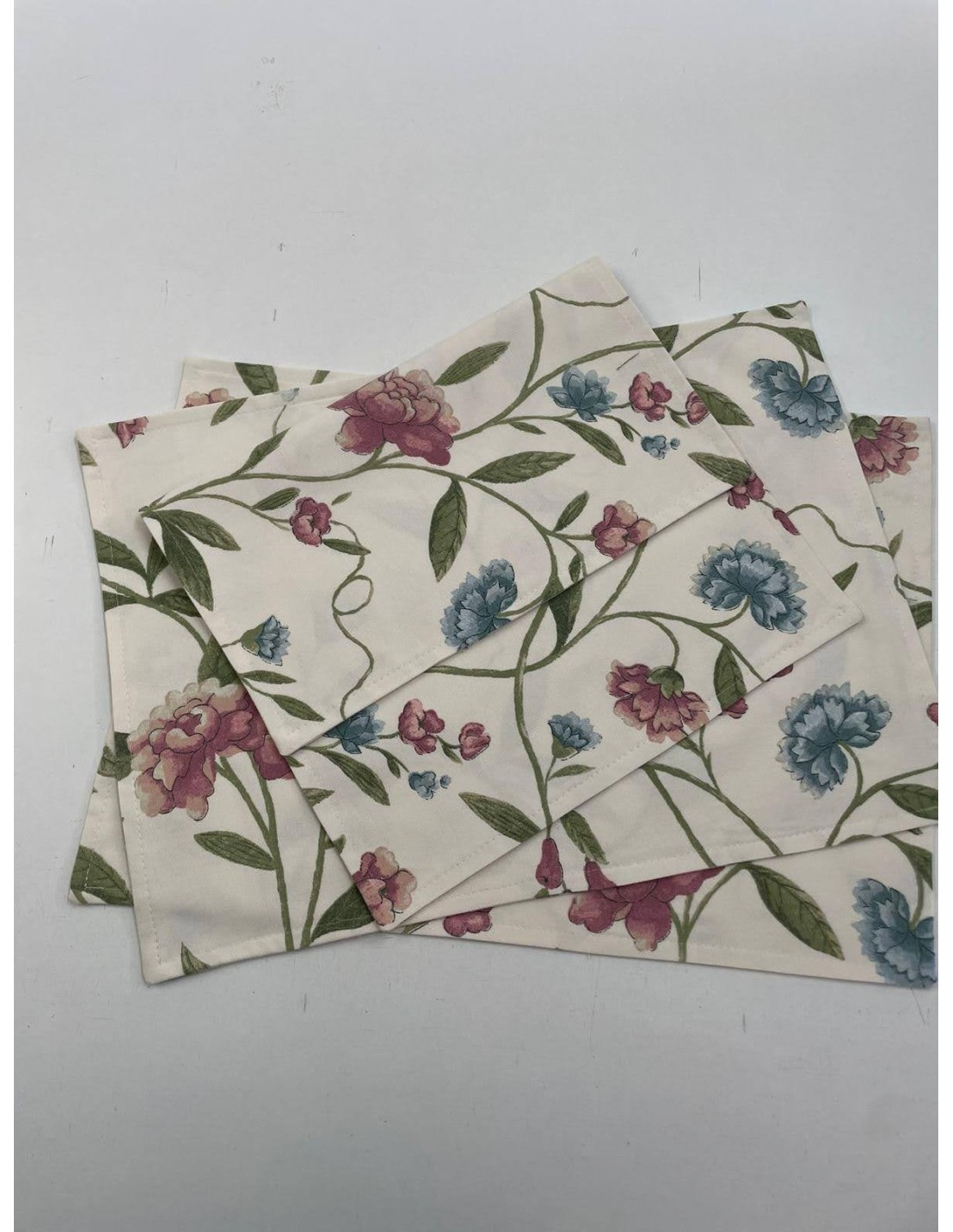 Mantel individual con estampado floral reversible en tonos rosas y verdes de medidas 50x35 y composicion 60% poliester y 40% algodón pack 4 unidades